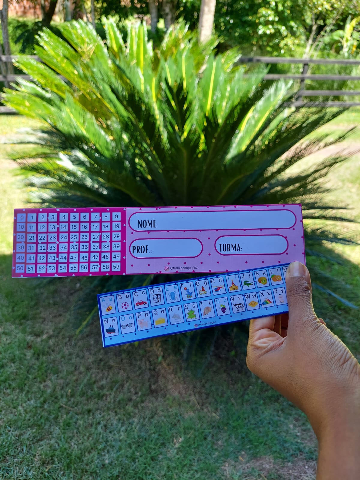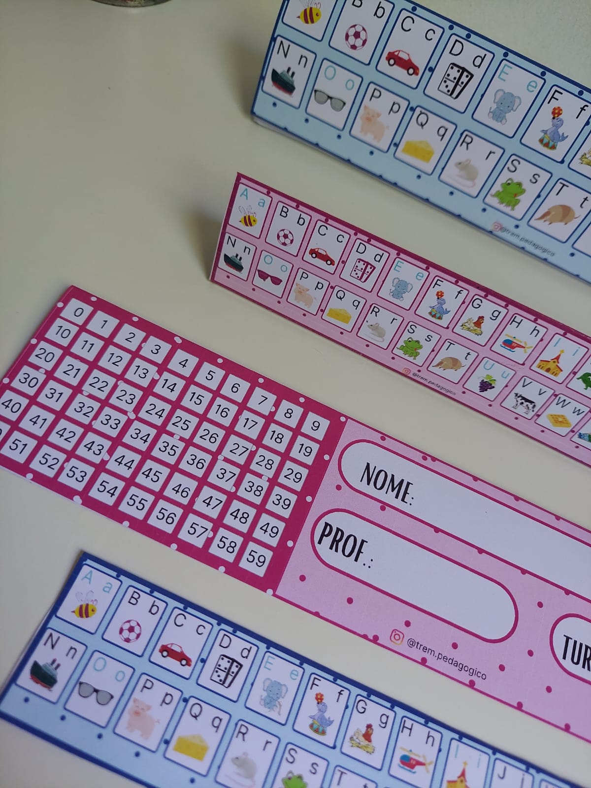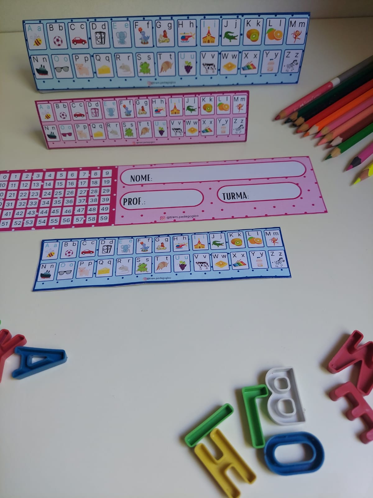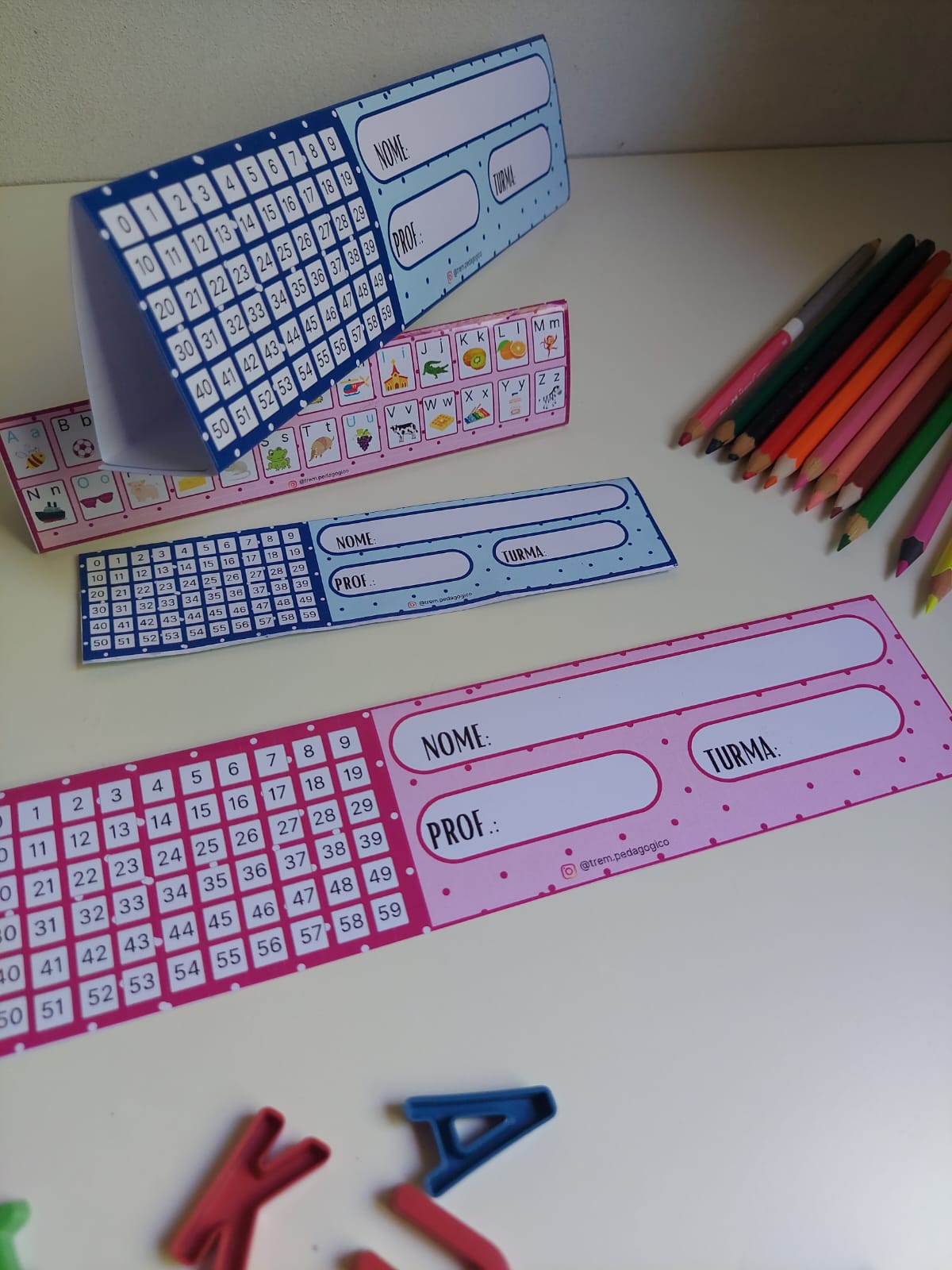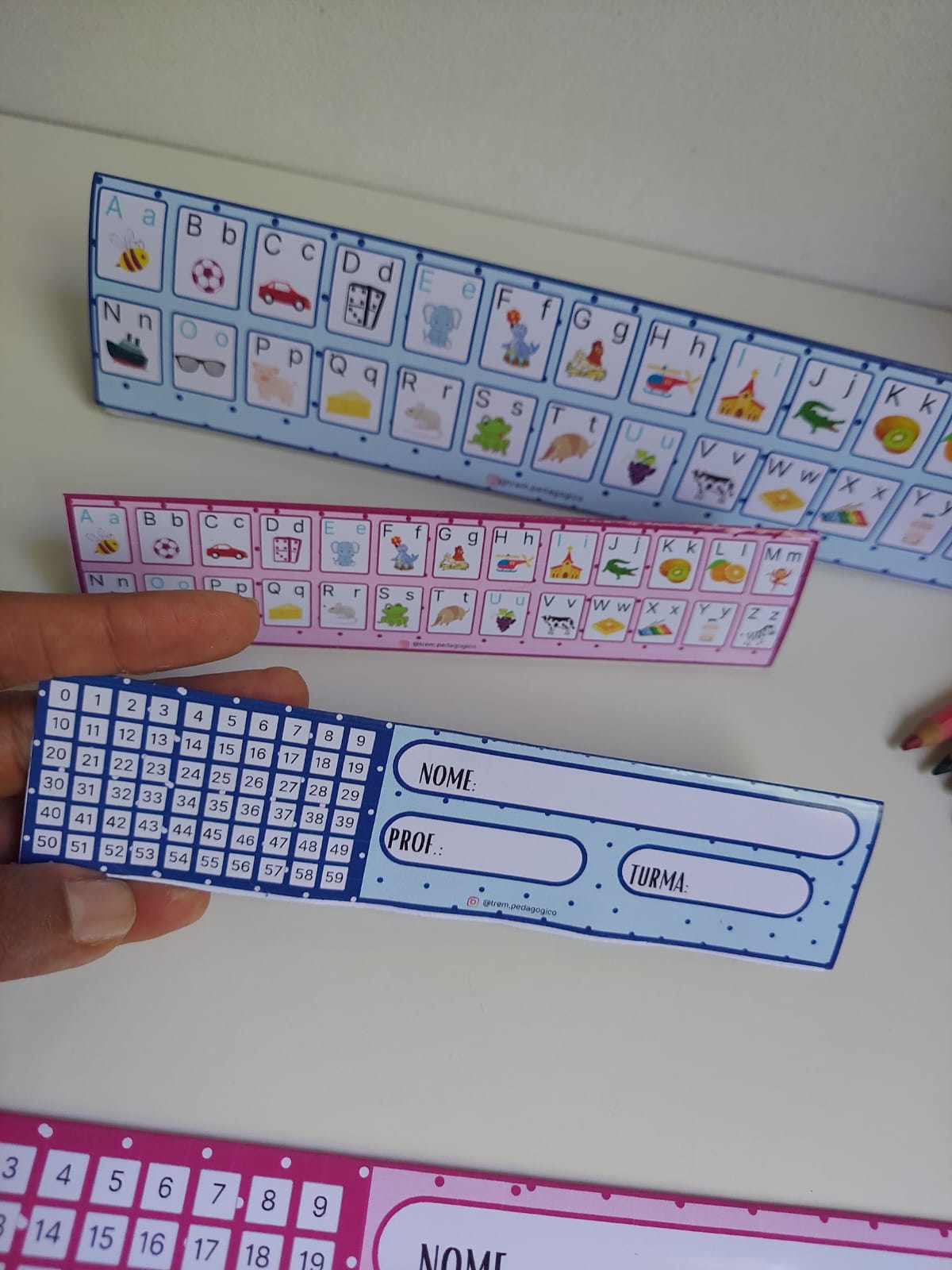 Este arquivo contém 3 páginas A4 para impressão: -1 crachá de mesa/ marca páginas nas medidas aproximadas de 25cm x 6cm em tons de azul; -1 crachá de mesa/ marca páginas nas medidas aproximadas de 25cm x 6cm em tons de rosa; -1 crachá de mesa/ marca páginas nas medidas aproximadas de 16.5 cm x 4cm em tons de azul; -1 crachá de mesa/ marca páginas nas medidas aproximadas de 16.5 cm x 4cm em tons de rosa; SUGERIMOS QUE FAÇA A IMPRESSÃO EM PAPEL DESENHO OU FOTOGRÁFICO, AMBOS COM GRAMATURA IGUAL OU SUPERIOR A 180GARQUIVO PDF VERSÁTIL: MARCA PÁGINAS/ CRACHÁ DE MESA/ NUMERAIS/ ALFABETO/ IDENTIFICAÇÃO DO ALUNO, PROF. E TURMA!