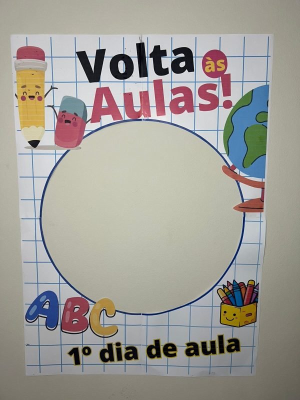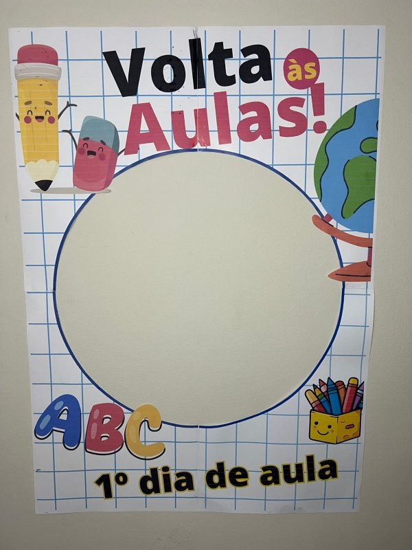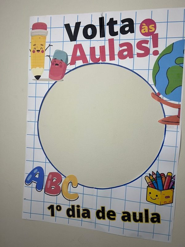 A moldura é ilustrada com símbolos escolares como lápis, livros, mochila, régua e outros elementos que representam o universo da escola, trazendo um visual lúdico, acolhedor e cheio de significado.